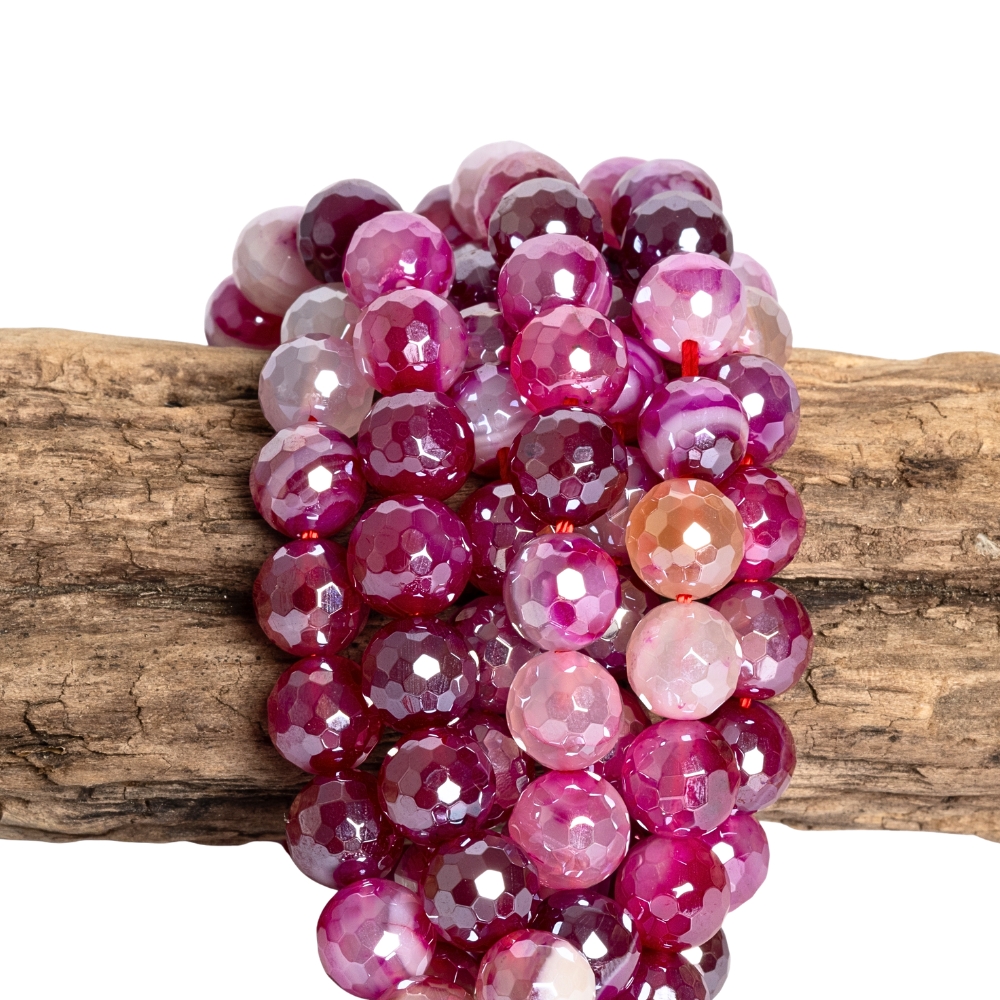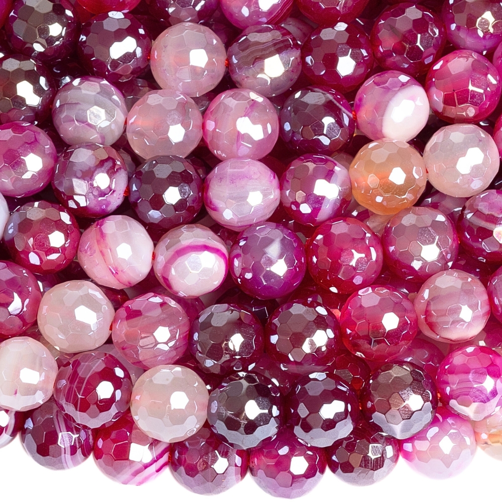 Achát krajkový korálky 8mm brúsené fuchsiové s pokovom šnúra