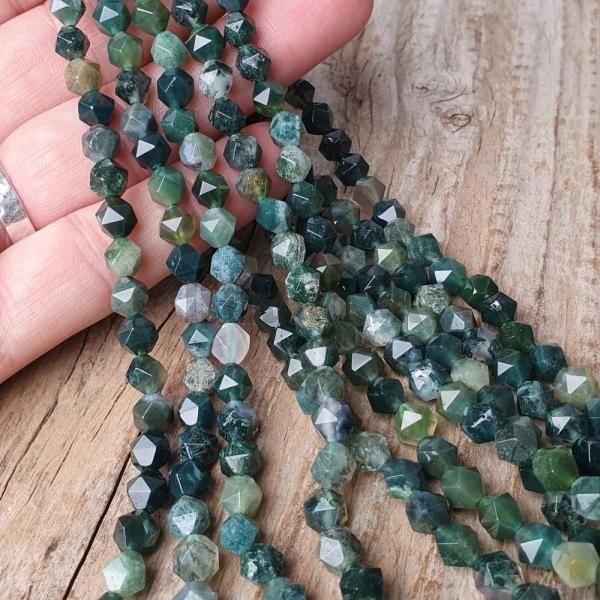 - Achát machový korálky 6mm bicone výbrus šnúra