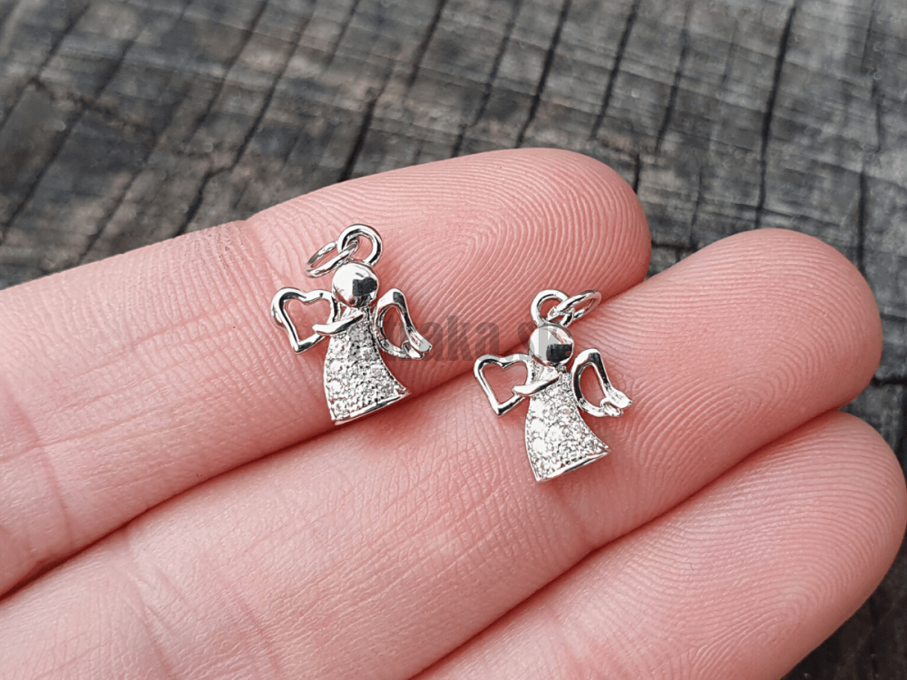 Maličký vkusný príveskový anjelik, vykladaný drobunkými kubickými zirkónmi. Anjelička vám dodávame spolu s krúžkom, takže ho môžete rovno navliecť medzi ostatné korálky do vašich minerálových náramkov.