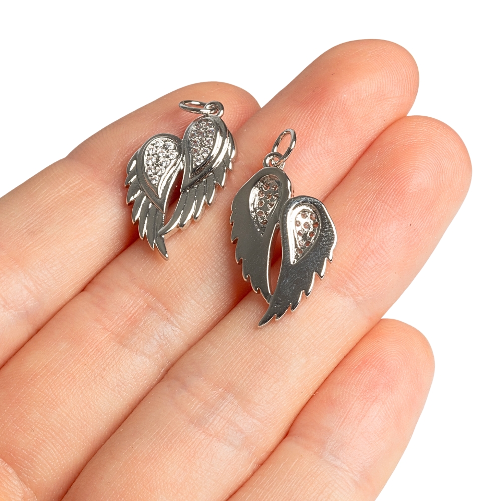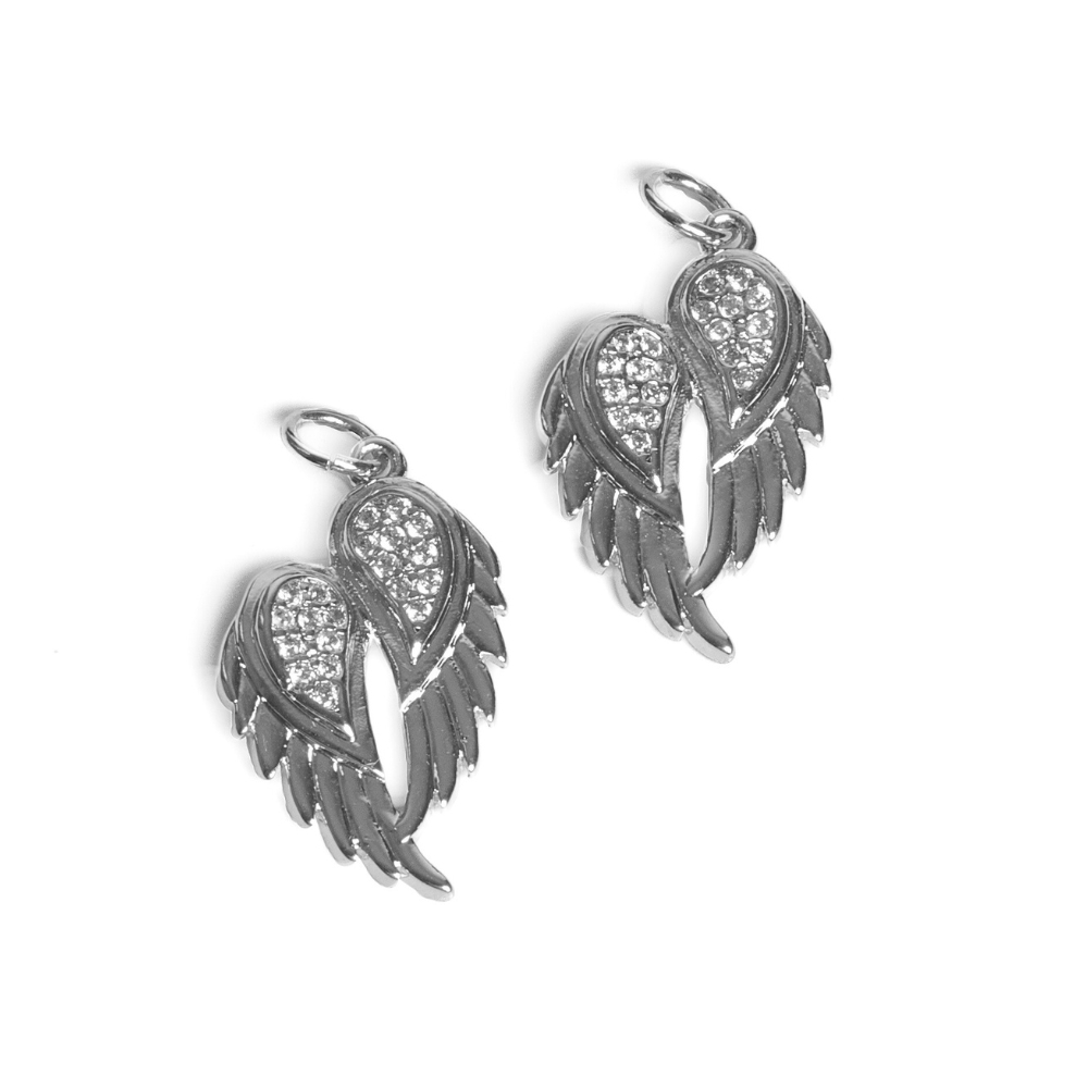 Prívesok dvojkrídlo zo striebornej zliatiny kovov a bielymi kubickými zirkónmi o veľkosti 22x14 mm.