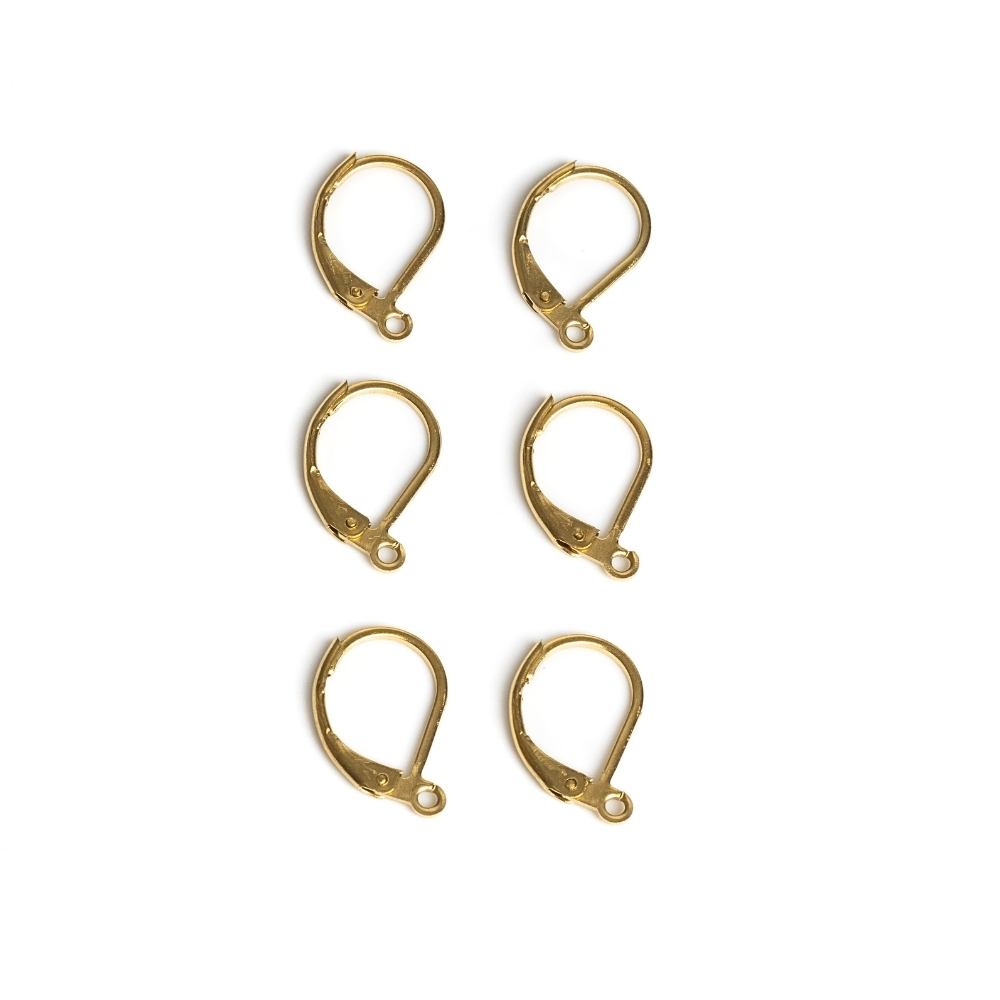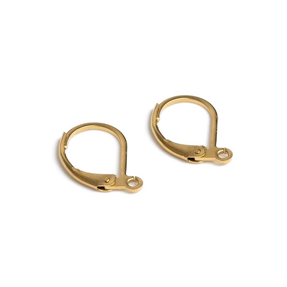 Bižutérne zatváracie náušnicové háčiky z nerezovej ocele zlatej farby vo veľkosti 15,5x10 mm.