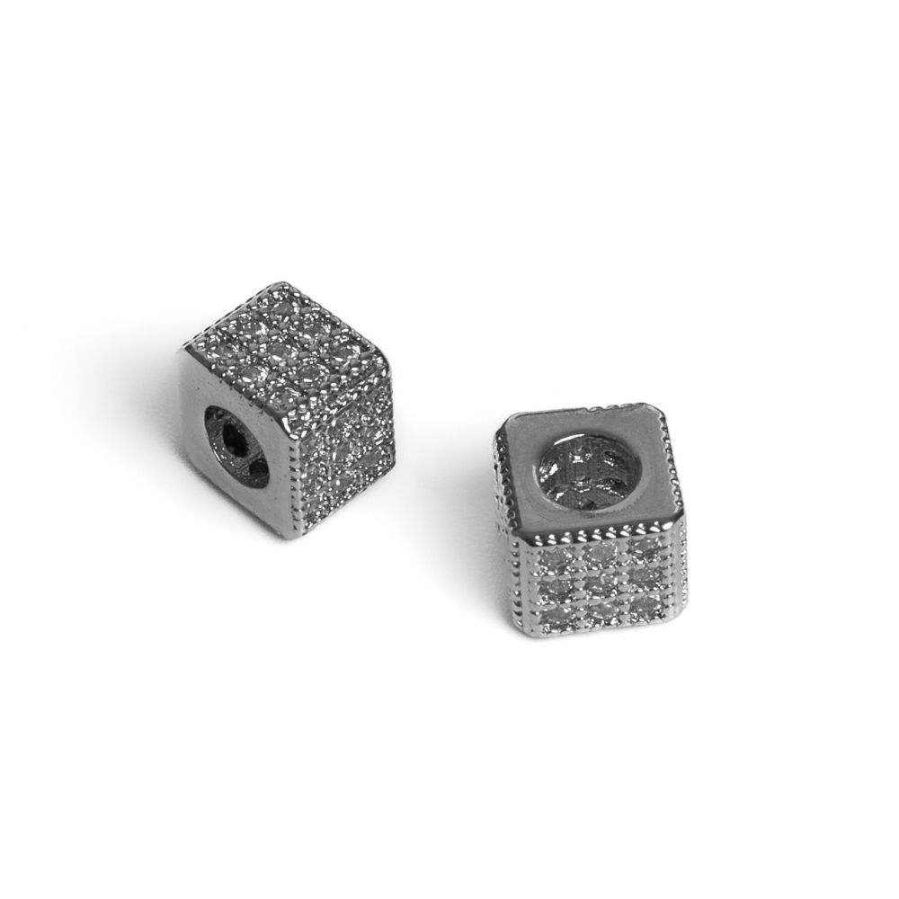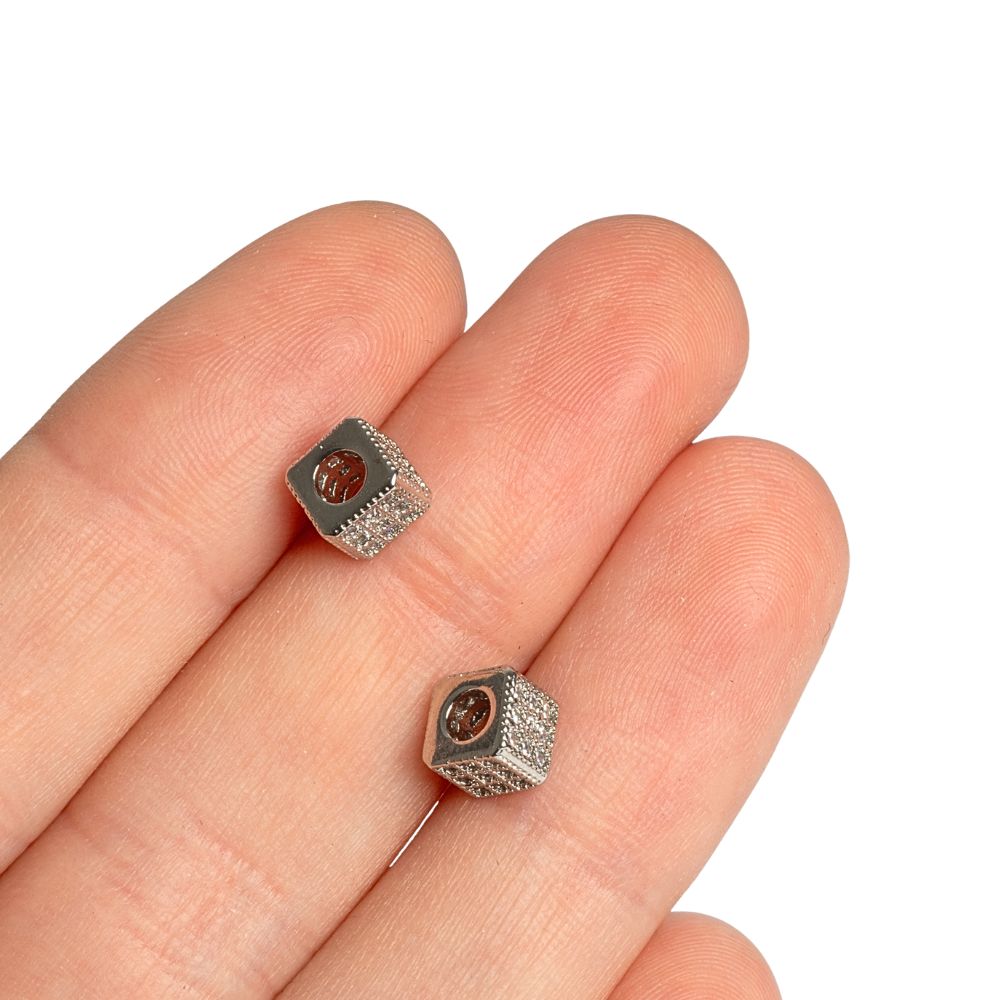 Korálka kocka zo striebornej zliatiny kovov a bielymi kubickými zirkónmi o veľkosti 6 mm.