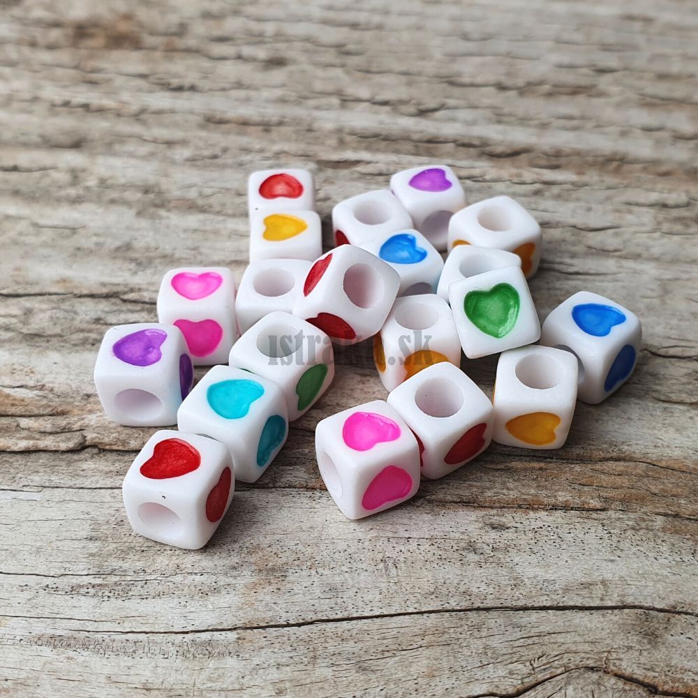 Plastové korálky v tvare kocky. Môžete ich použiť na výrobu shamballa náramkov, alebo navliecť na elastickú gumičku s farebnými korálkami. V mixe sú srdiečka v rôznych farbách, vždy v pároch.