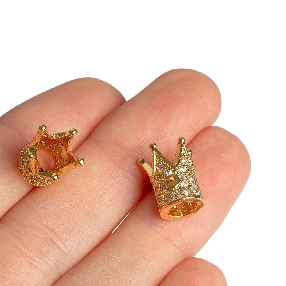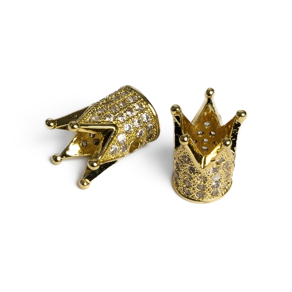Podlhovastá kovová korunka vykladaná kubickými zirkónmi. Korunky sú veľmi pekné a kryštáliky pekne precízne povsádzané. Stačí mať jednu takúto ozdobnú korunku a váš náramok sa hneď krásne rozžiari :) Najkrajšie zapasujú korunky k 8mm a 10mm korálkam. Dierky sú cca 1,1mm veľké.