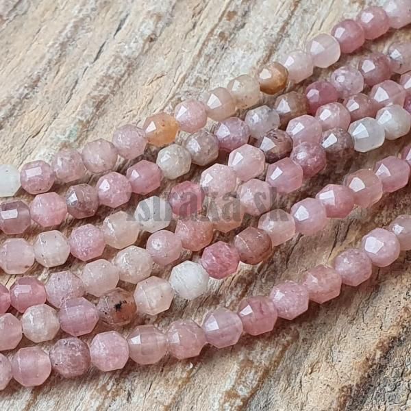 Drobné brúsené korálky z kremeňa v tvare kociek. Korálky majú veľmi jemnučký svetloružový nádych, ten však vplyvom svetla bude blednúť, až budú korálky časom úplne biele.