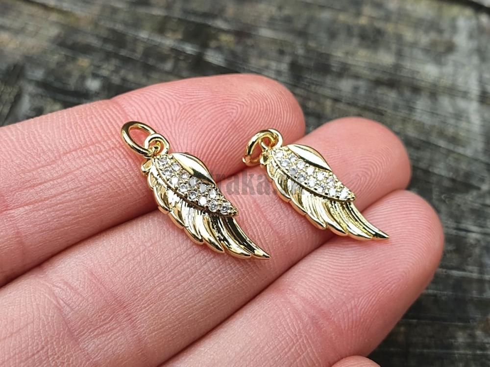 Prívesok krídlo zo zlatej zliatiny kovov a bielymi kubickými zirkónmi o veľkosti 19x7 mm.