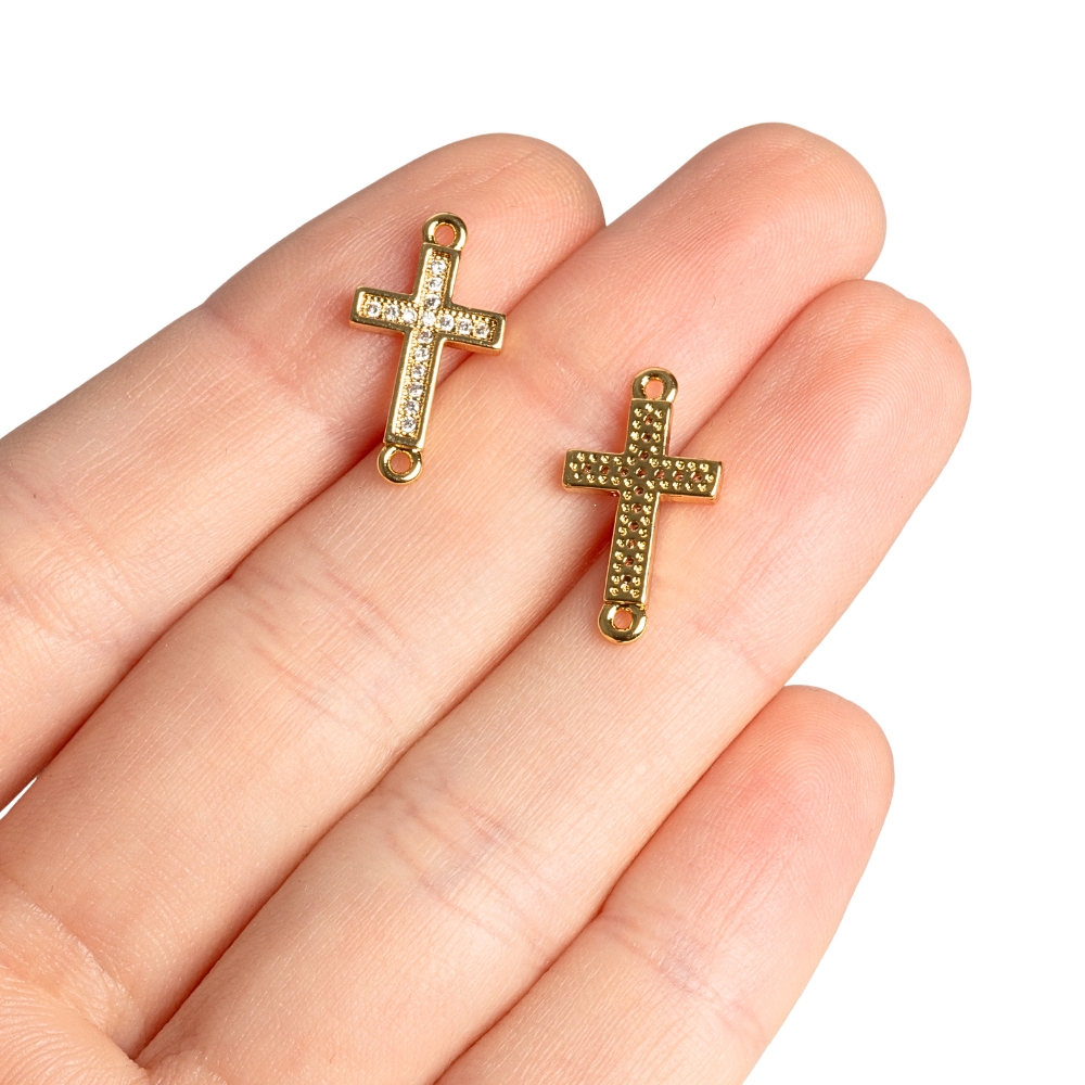 Náramkový medzikus kríž menší zo zlatej zliatiny kovov a bielymi kubickými zirkónmi o veľkosti 18x9,7 mm.