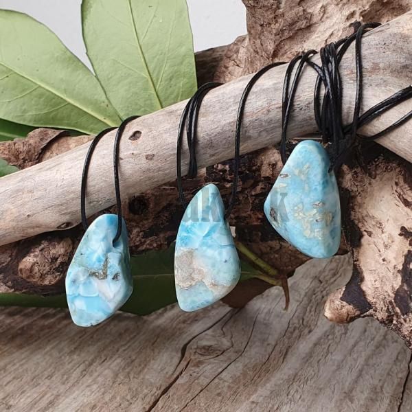 Náramok z prírodného minerálu larimar s lesklým povrchom. Nepravidelné oblé rondelky sú navlečené na elastickej šnúrke a vnútorný obvod náramku je väčší, než obvod ostatných našich náramkov - rozmery 16,5 až 17,5 cm. Preto je vhodnejší skôr pre pánov, no rovnako krásne sa bude vynímať na zápästí žienky, ktorá má rada, keď sú náramky na ruke v pohybe. :)