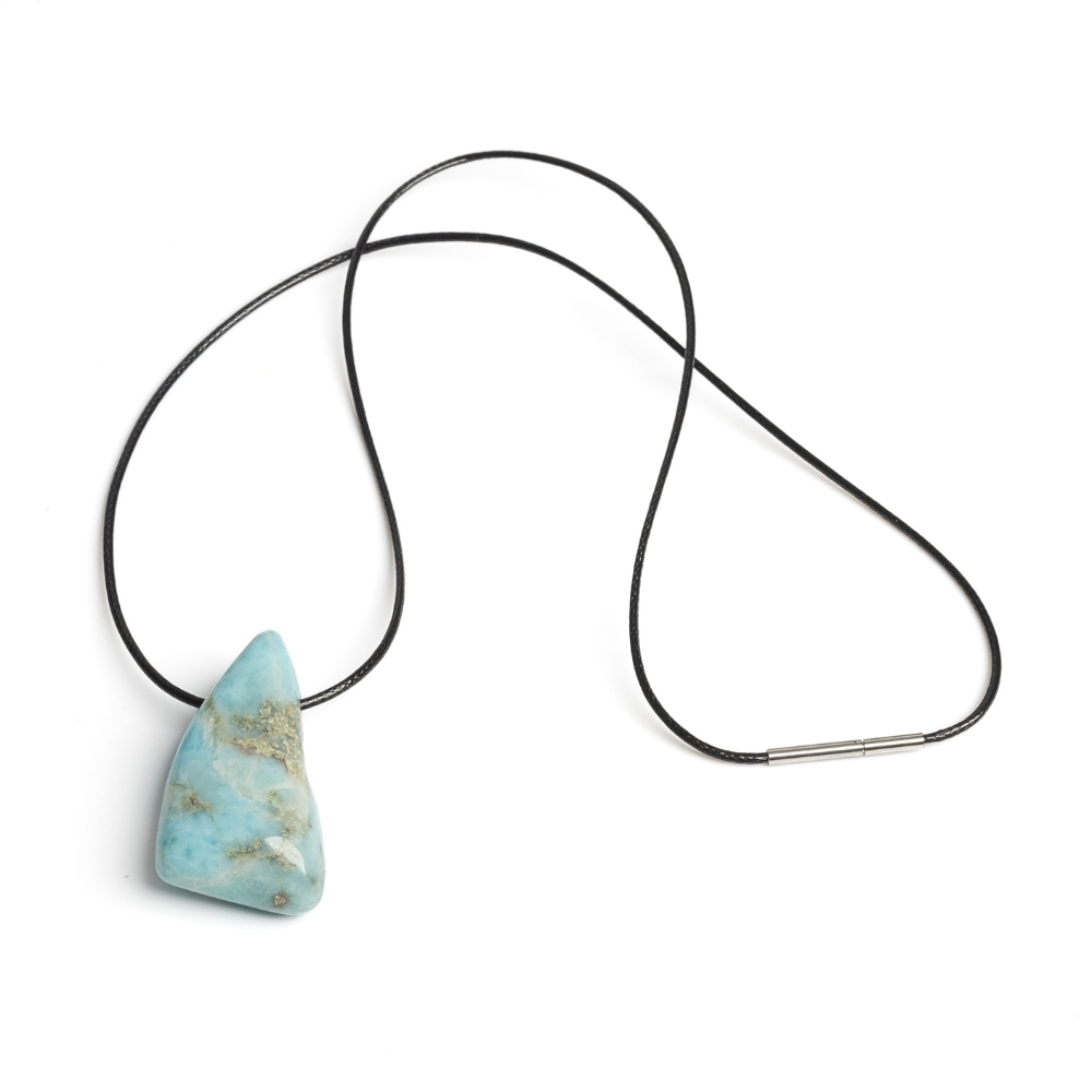 Náramok z prírodného minerálu larimar s lesklým povrchom. Nepravidelné oblé rondelky sú navlečené na elastickej šnúrke a vnútorný obvod náramku je väčší, než obvod ostatných našich náramkov - rozmery 16,5 až 17,5 cm. Preto je vhodnejší skôr pre pánov, no rovnako krásne sa bude vynímať na zápästí žienky, ktorá má rada, keď sú náramky na ruke v pohybe. :)