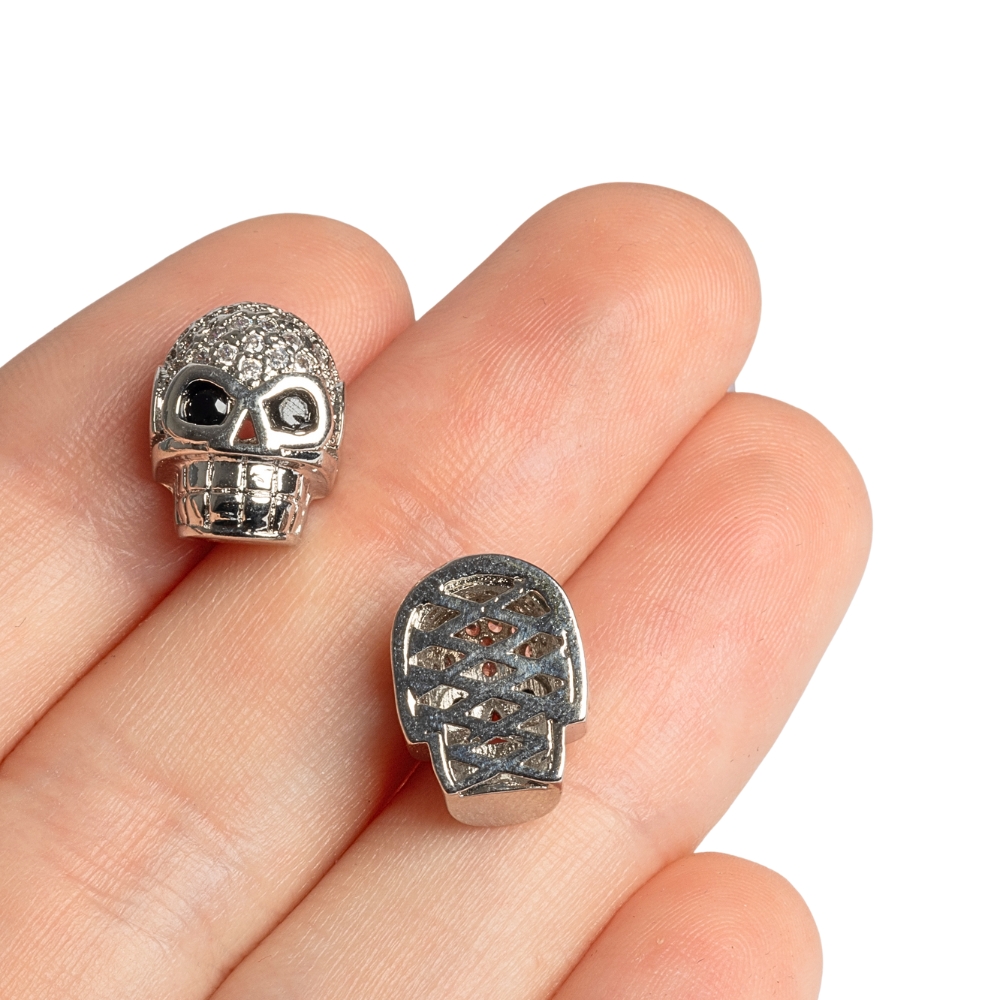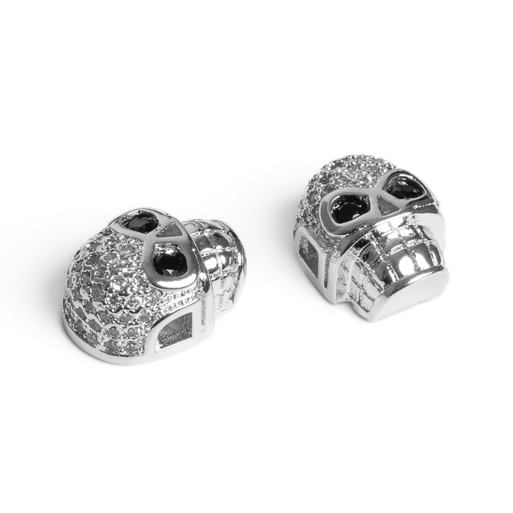 Kovová plochá lebka s precízne povkladanými kubickými zirkónmi. Dierky sú zboku.