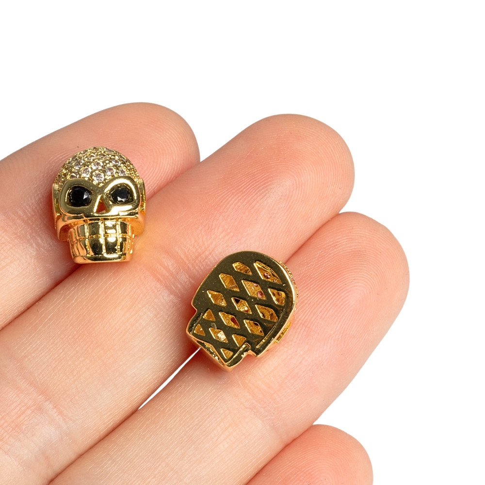 Kovová plochá lebka s precízne povkladanými kubickými zirkónmi. Dierky sú zboku.