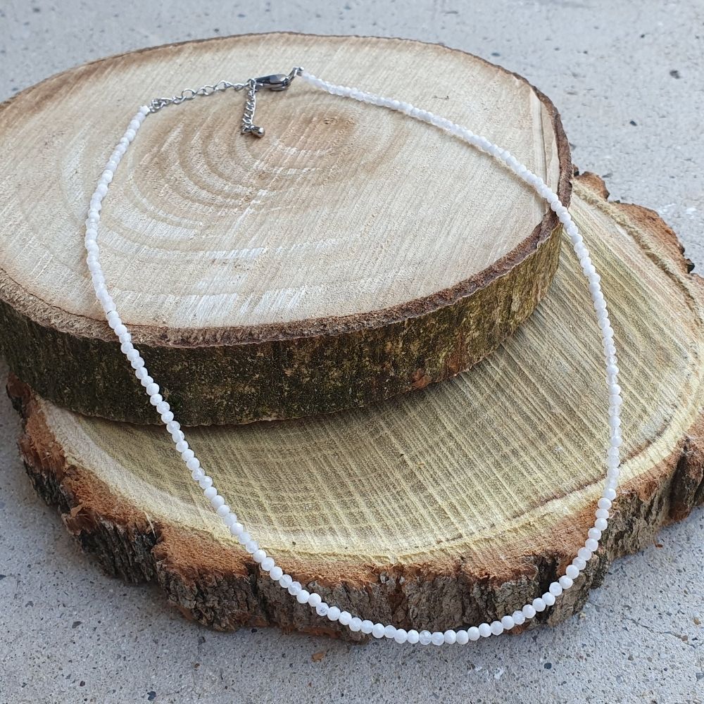 Jemný elegantný náhrdelník z minerálu mesačný kameň biely. Náhrdelník je tvorený brúsenými malinkými korálkami a je ukončený karabinkou a predlžovacou retiazkou dlhou cca 6 cm, takže si môžete regulovať jeho dĺžku.