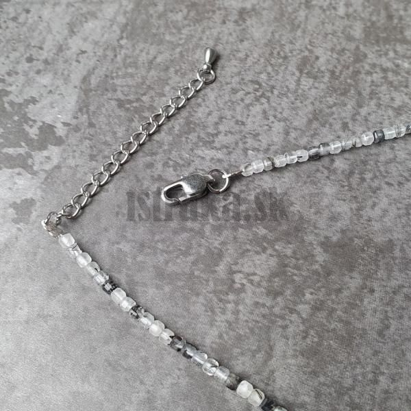 Jemný elegantný náhrdelník z minerálu krištáľ s čiernym turmalínom. Náhrdelník je tvorený brúsenými minikorálkami v tvare kociek a je ukončený karabinkou a predlžovacou retiazkou, takže si môžete regulovať jeho dĺžku.