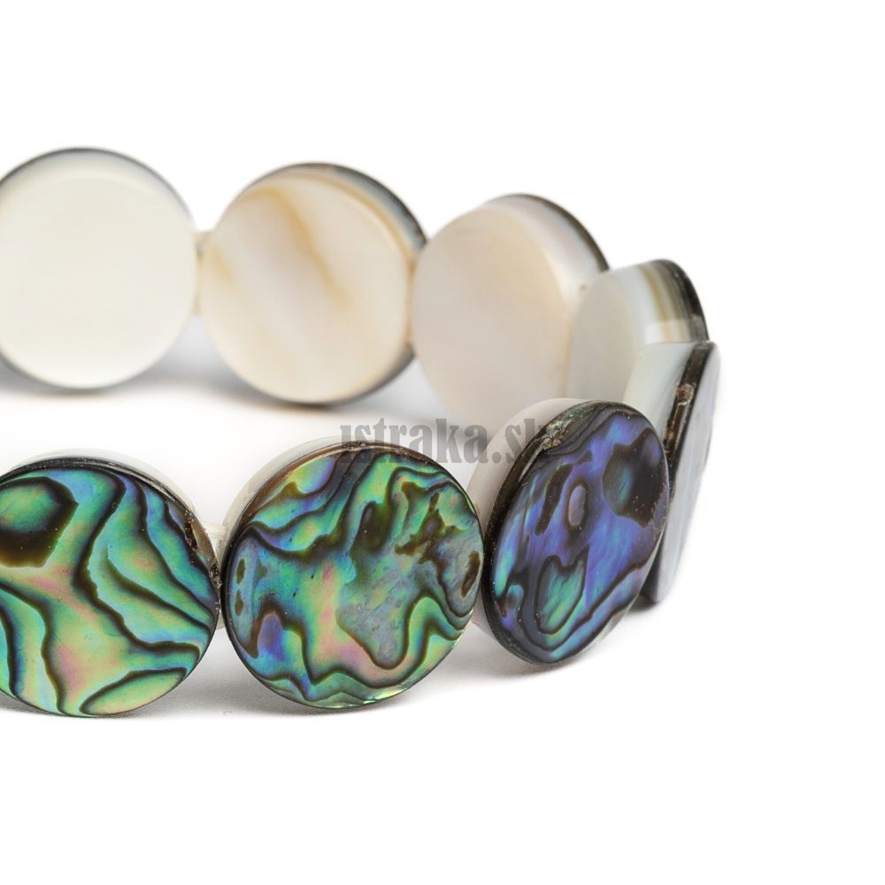 Plochý elastický náramok z prírodnej perlete abalone v tvare kruhu.