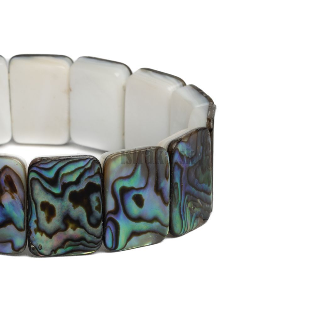 Plochý elastický náramok z prírodnej perlete abalone v obdĺžnikovom tvare.