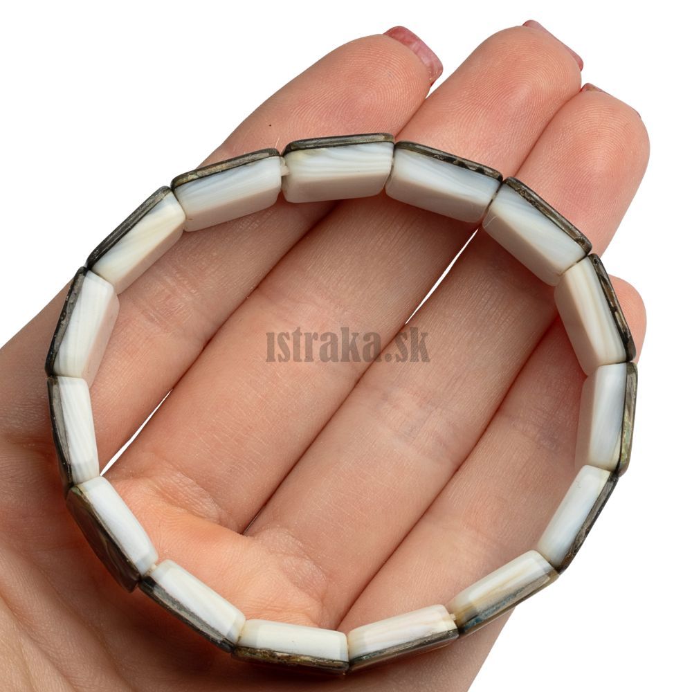 Plochý elastický náramok z prírodnej perlete abalone vo štvorcovom tvare.