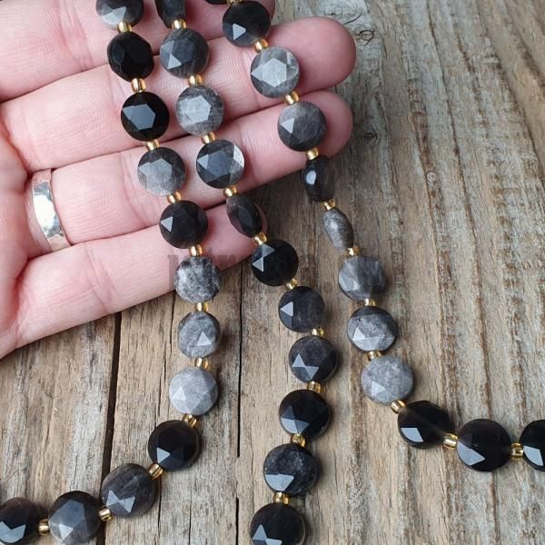 - Obsidián strieborný korálky 10mm disky brúsené polšnúra