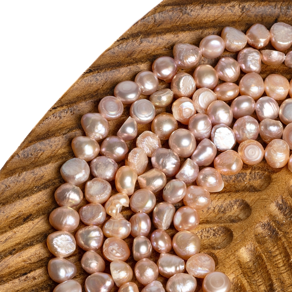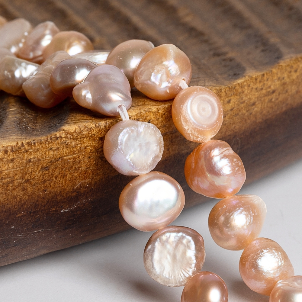 Krásne nepravidelné perly s plôškou na jednej strane ružovo-lososovej menivej farby.