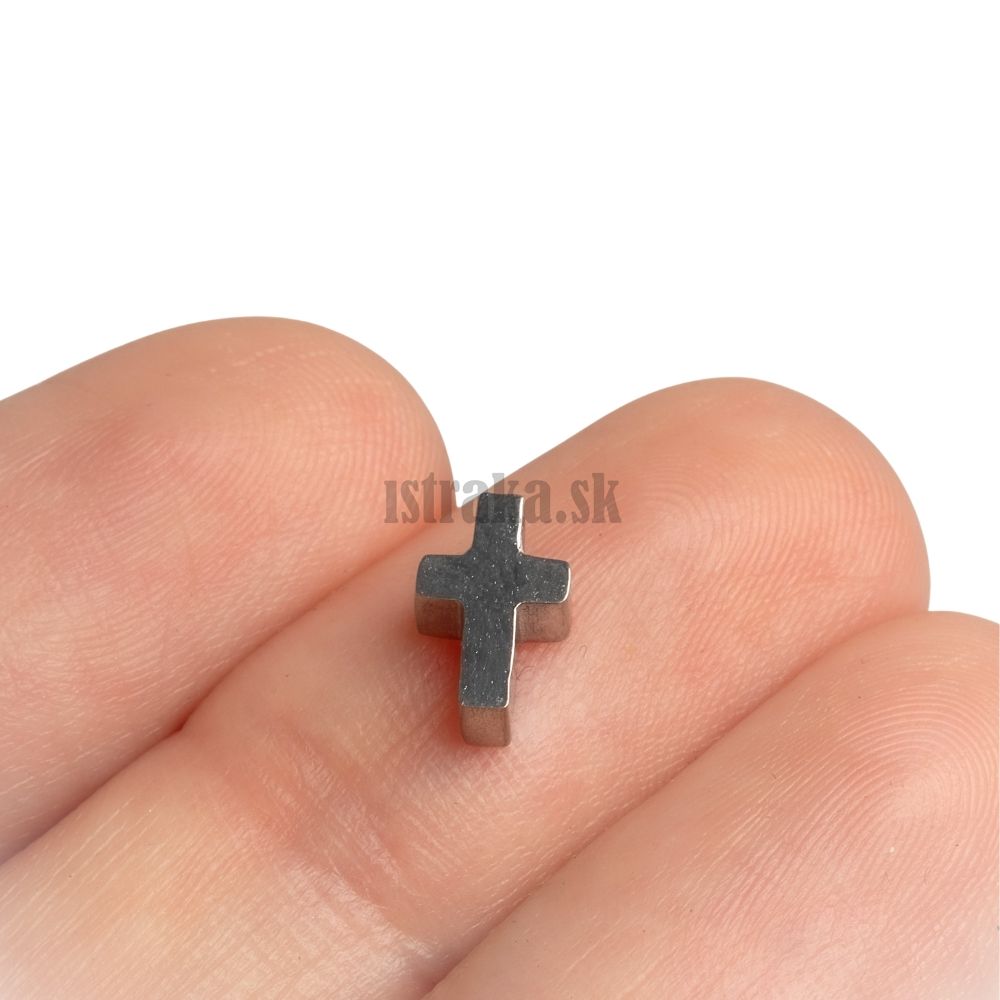Drobný prívesok v tvare krížika z nerezovej ocele starostriebornej farby. Krížik má celkom solídnu dierku, pohodlne cez ňu prevlečiete niektorú našu nerezovú retiazku ukončenú ihlou.