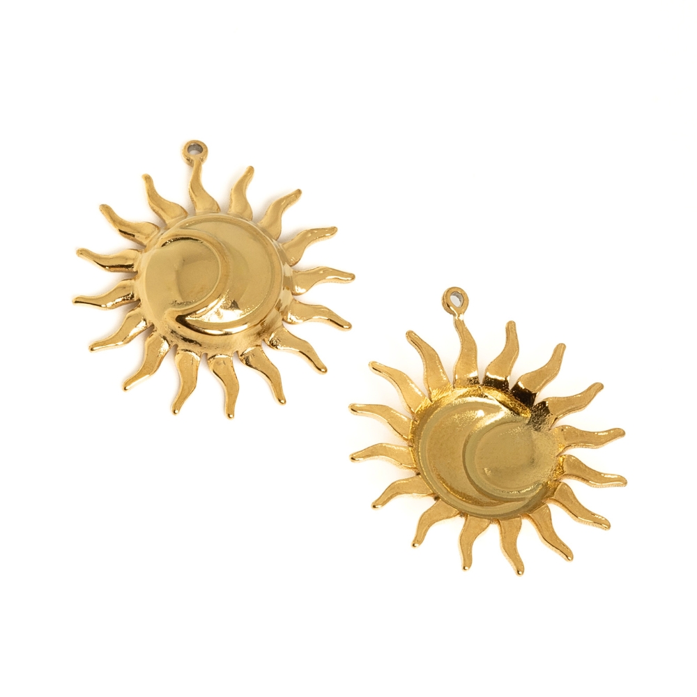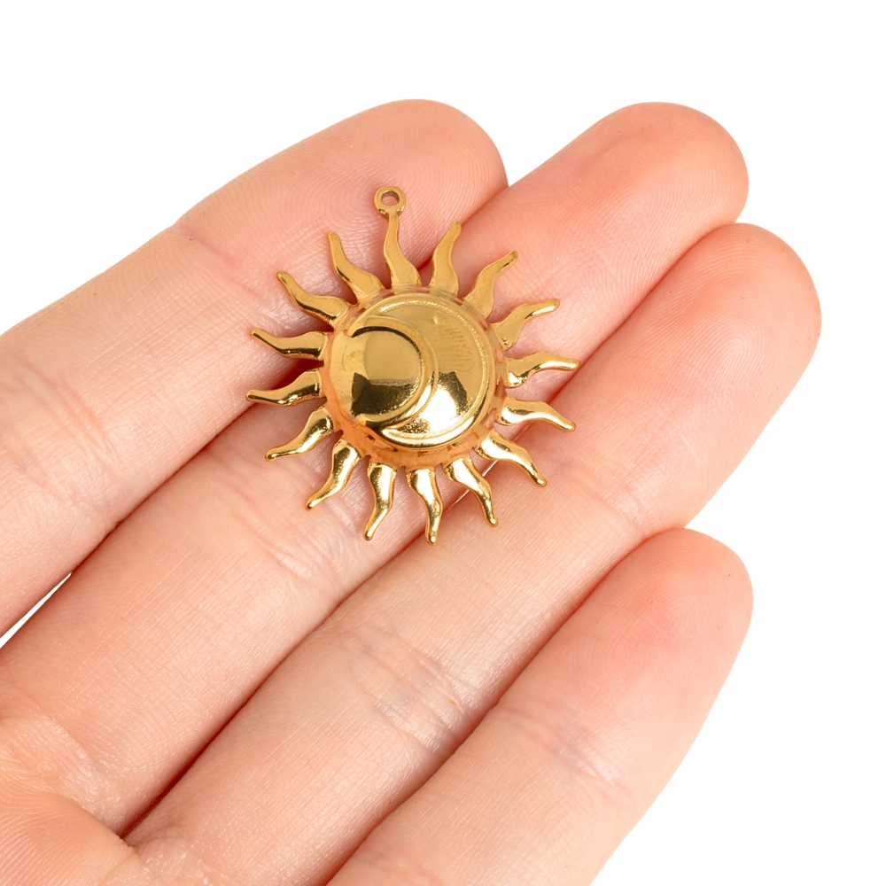 Prívesok z nerezovej ocele v tvare slnka s mesiacom vo vnútri. Prívesok má kvalitnú IP povrchovu úpravu. Pekne doplní vaše letné minerálové náhrdelníky.