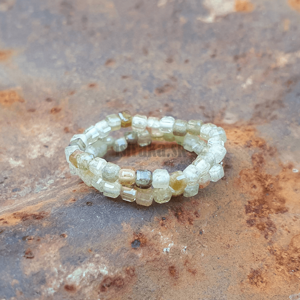 Jemný prsteň z prírodného minerálu ametrín (ametyst a citrín) . Korálky v tvare kociek sú navlečené na gumičke, takže prstienok je elastický.