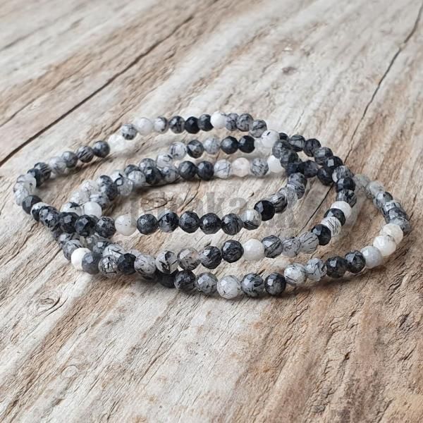 Náramok z prírodného minerálu krištáľ s turmalínom tvorený čiernobielymi brúsenými korálkami. Náramok je elastický a pre pohodlné nosenie vhodný na zápästie s obvodom maximálne 16,3 cm.