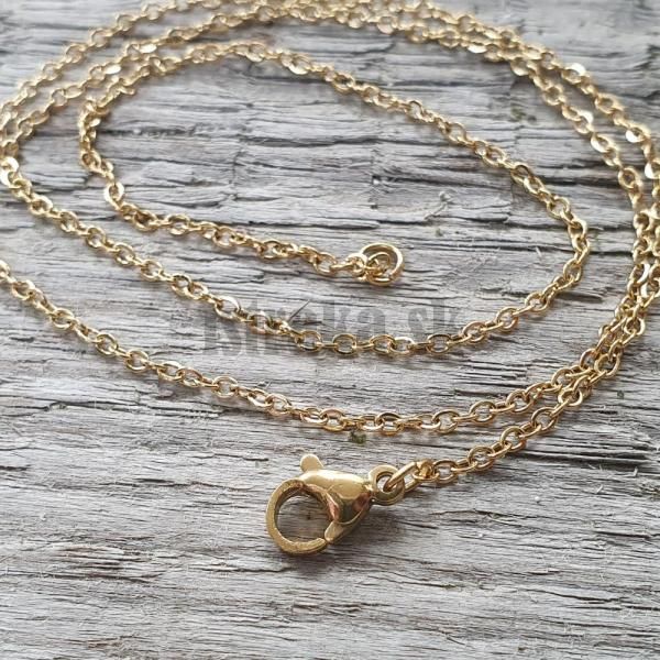 Nerezová retiazka zlatej farby s dĺžkou 60cm + s nadpojenou predlžovacou časťou, ktorá má 5cm. To znamená, že retiazka má variabilné rozpätie od 60 do 65cm ;)