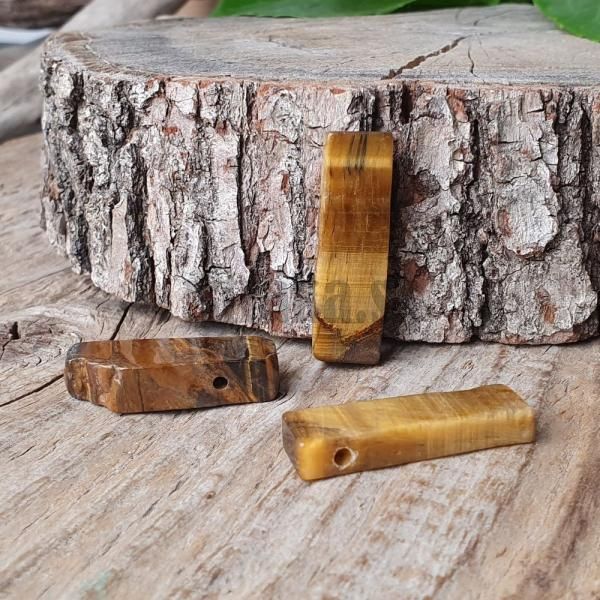 Hranatý prívesok z prírodného minerálu tigrie oko v tvare nepravidelného kvádru s lesklým hladkým povrchom.