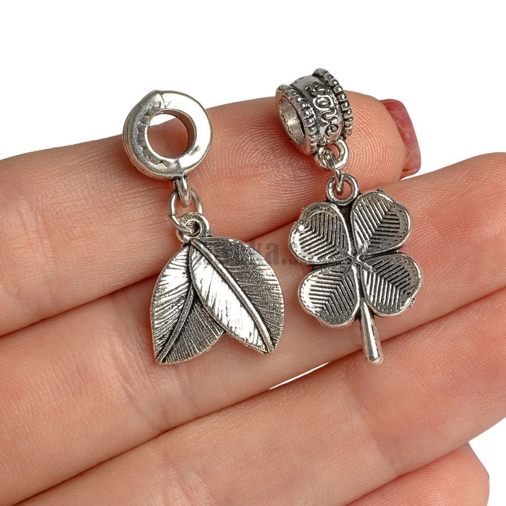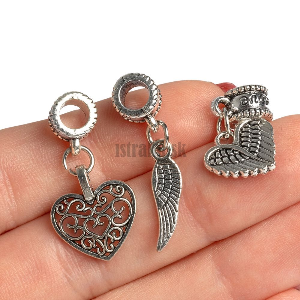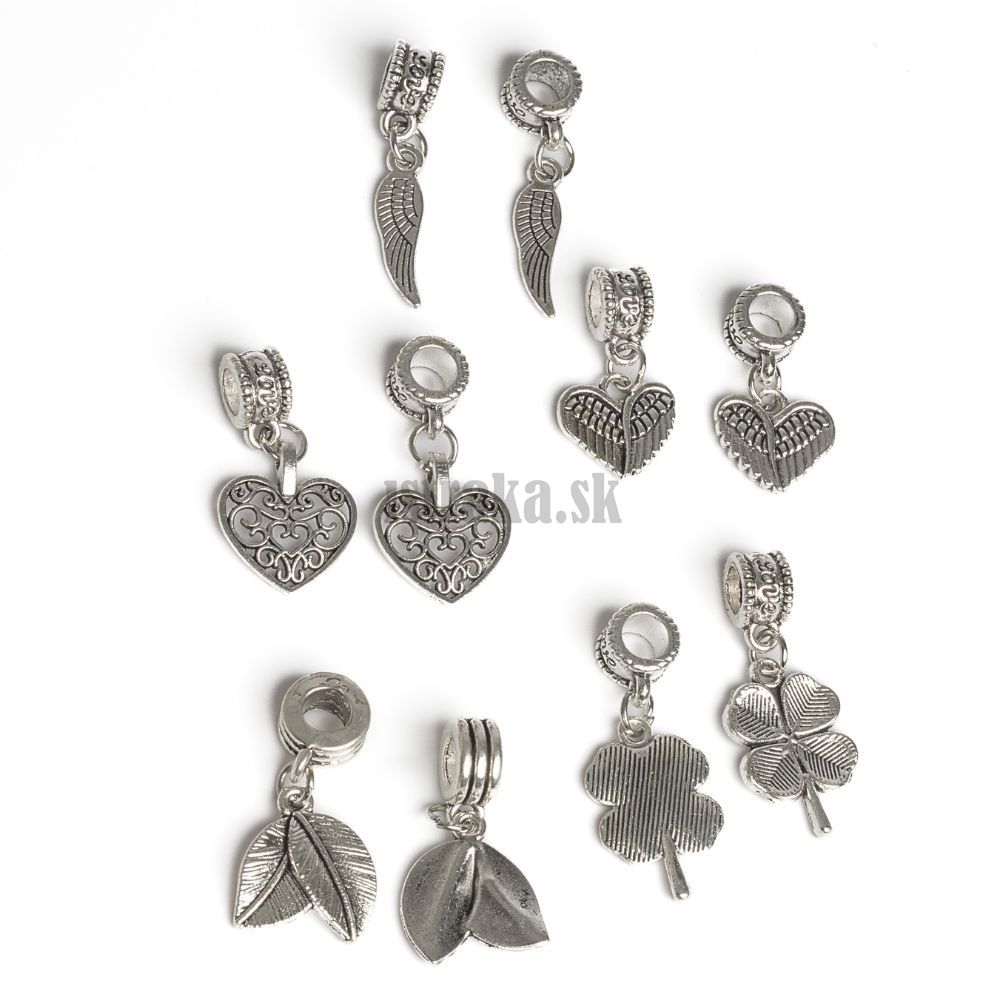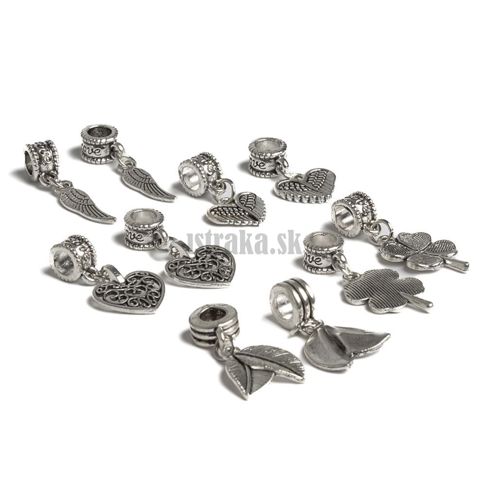 Set kovových príveskov, ktoré sú už pripevnené na korálky so závesom. Stačí ich len pri navliekaní pridať k ostatným korálkam na náramku. V balíčku nájdete 5 druhov motívov, z každého po dva kusy.