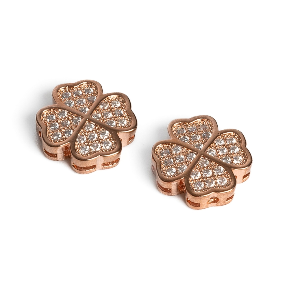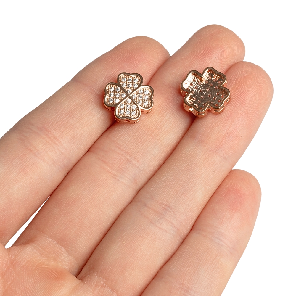 Plochá zliatinová korálka, povykladaná malinkými kubickými zirkónmi (cubic zirconia = skratka CZ). Korálka má mnoho dierok po celom obvode, takže ju viete otočiť do náramku podľa svojich prianí. Štvorlístok je trošku vyvýšený a vzor je len z jednej strany, takže uzlík môžete schovať dolu do výrezu v korálke :) Kombinujte ho najmä s 8mm minerálmi, odporúčame ruženín, jadeity, krištáľ, rodonit, hemimorfity, morganit avšetky ostatné kamene s jemnými, pastelovými odtieňmi :)