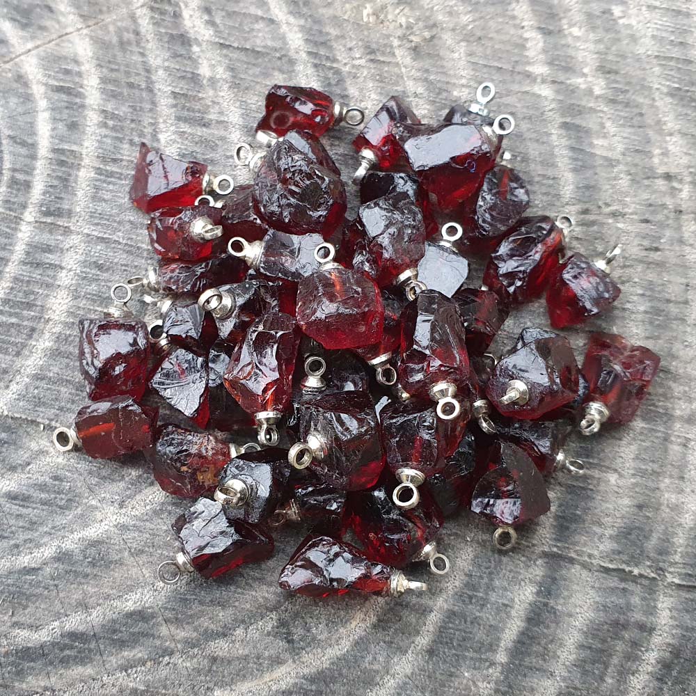 Malinký prívesok zo surového granátu so strieborným závesom.
